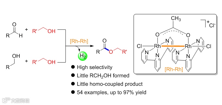 陕西师范大学的王超副教授及肖建良教授和其团队成员使用以简单三联吡啶为配体的双金属铑络合物为催化剂实现了高选择性的醛和醇之间的无氧化剂脱氢偶联反应,并首次实现了不同伯醇之间的无氧化剂交叉脱氢偶联成酯。传统的酯化反应一般通过羧酸或羧酸衍生物和醇反应制得,反应过程中可能会产生当量的废物。醛和醇或者醇和醇之间的无氧化剂脱氢成酯反应副产物仅为氢气,是对传统酯化反应的一种绿色补充,不过,醛和醇之间以及伯醇和伯醇之间的交叉无氧化剂脱氢偶联成酯反应的选择性问题一直未能解决。
