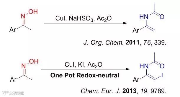 肟酯是一类简单、易得的有机化合物,然而传统有机化学中对肟酯的化学反应研究较少。西北大学关正辉教授课题组在2011年曾发展了铜催化还原酰化酮肟合成取代烯酰胺的反应(J. Org. Chem., 2011, 76, 339-341; Chem. Eur. J., 2013, 19, 9789- 9794),该反应原料易得、条件温和、产率高,为烯酰胺、碘代烯酰胺等的实验室合成提供了高效的方法。文章中作者还提出了一价铜催化下肟酯N-O键的单电子裂解机理。