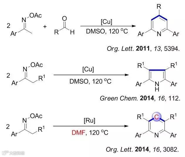 随后,该课题组对机理进行了研究,实验证实了一价铜催化下肟酯N-O键的单电子裂解机理。并在此基础上对铜催化肟酯的偶联反应进行了扩展,发展了铜催化肟酯和醛环化合成2,4,6-三取代对称吡啶(Org. Lett., 2011, 13, 5394-5397),铜催化肟酯自偶联合成对称吡咯(Green Chem., 2014, 16, 112-115),以及钌催化肟酯和DMF环化合成2,3,5,6-四取代对称吡啶(Org. Lett., 2014, 16, 3082-3085)等系列新反应。