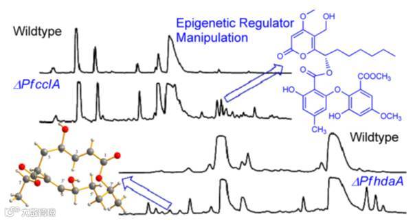 中国科学院微生物研究所尹文兵研究员及其研究团队通过对植物内生真菌无花果拟盘多毛孢中的表观遗传调控因子进行定向遗传敲除,使该菌的次级代谢产物指纹图谱发生了巨大变化,从中分离鉴定得到了15个新的天然产物。并通过同位素示踪法阐释了Ficiolide A的合成途径。