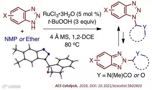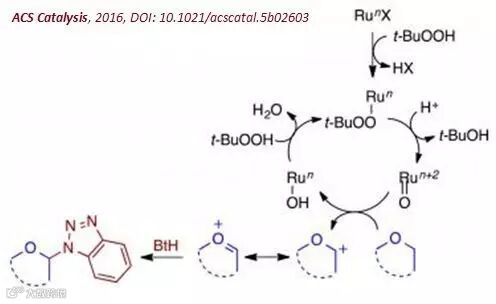 研究人员以苯并三唑或5,6-二甲基苯并三唑为底物,在钌催化剂的作用下,与N-甲基吡咯烷酮(NMP)、四氢呋喃(THF)、四氢吡喃(THP)、乙醚、1,4-二氧六环或异色满(isochroman)发生C(sp3)-N成键反应,得到N1和N2烷基化产物。与其他涉及自由基的形成半胺醛醚(hemiaminal ether)的反应相比,这种由钌催化的过程即使在自由基抑制剂的存在下也不会受到抑制。可能的反应机理图示如下。