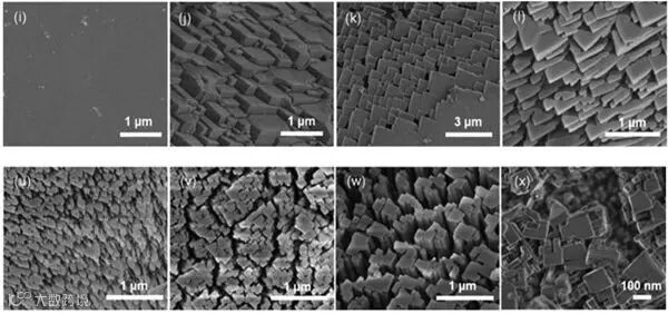 图2. 分子筛SSZ-13的形貌。 扫描电镜:(i)SSZ-13-R, (j)SSZ-13-F,(k)SSZ-13-F-M1, (l)SSZ-13-F-M5, (u)SSZ-13-F-M10, (v)SSZ-13-F-M25, (w)SSZ-13-F-M50;高分辨率扫描电镜:(x)SSZ-13-F-M50。