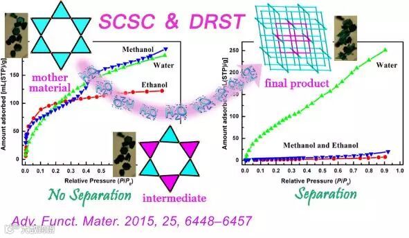 郑州大学臧双全教授课题组首次报道了一例集单晶-单晶(SC-SC)和溶解-重结晶(DRST)为一体的微孔配合物结构转变过程,捕获到该过程中的转变中间态,并对这两种不同类型的结构转变进行了详细的分析和表征,推测出一个更加合理的结构转变机理。基于所制备的材料都具备微孔特性,而结构与性质又具有密不可分的关系,因此作者对结构转变前后的材料测试了其对蒸汽的吸附性能。转变前的材料对水和醇的蒸汽均有较大的吸附量,不具有分离效果,而结构转变后的材料只选择性的吸附水蒸汽,并且伴随有无定形态到晶态的结构转变,对醇的蒸汽没有任何吸附作用,可以用于醇中少量水的分离,从而通过结构转变实现其分离性能。