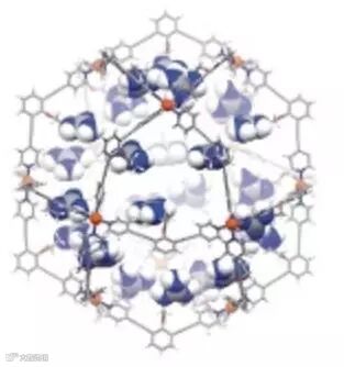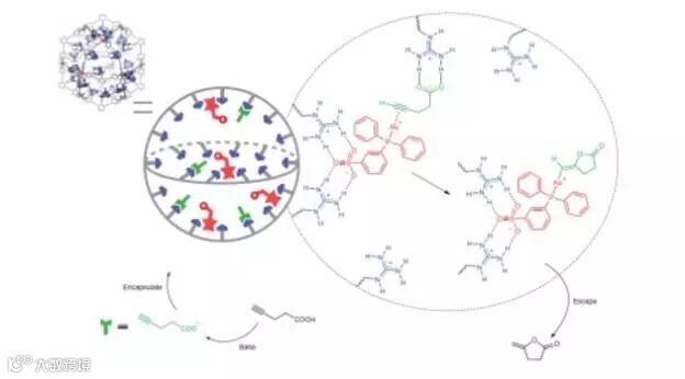 新的纳米容器通过自组装而形成:它混合了12个钯金属原子和24个所谓“ditopic”的氮配体以形成纳米尺寸的球体。这种配体被能与胍结合的基团修饰,以使所得到的纳米容器能够在其内部结合磺酸盐和羧酸盐。由于所谓的协同结合(采用多个结合位点),“入住”的磺酸盐因此比羧酸盐更强烈的结合其中。这些研究人员利用这种机理在纳米球中牢固地固定住基于磺酸化金的催化剂,而其余的结合位点可用于预组织需要转换的羧酸酯部分(底物)。