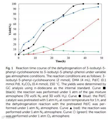 采用气相检测的方法,通过对比不同气体氛围下的实验结果,他们发现向Pd/C催化剂中加入适量的氢不仅不会抑制Pd/C的催化脱氢性能,反而可以作为助催化剂促进该催化反应,因此他们称这种催化体系为“reaction- activated catalysts”。H2对催化剂Pd/C的影响决定于H2的量:太多的H2使Pd/C表现出催化加氢性能;适量的H2可以作为助催化剂促进Pd/C催化脱氢反应;一些该催化脱氢反应不需要外H2,因为其本身可产生足量的H2起到助催化作用。