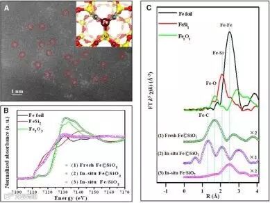 从电镜中,我们可以看到氧化硅晶格上分布的铁单原子的亮点。通过X射线吸收精细结构谱,也能够发现这种铁氧化硅催化剂中没有Fe-Fe键,即铁原子是以单中心的形式以化学键分布在氧化硅的表面上。