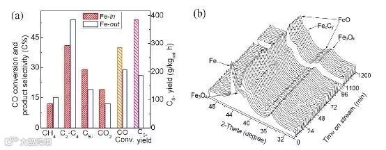这种方法是研究者首次采用化学方法得到了以内壁负载为主的可用于量产的负载型碳纳米管催化剂。由于碳纳米管壁的C-C键的畸变,管内外电势差发生了偏移,管内的电子结构发生了改变,影响了内壁中的铁中心的还原性。原位XRD的结果中显示,管内壁中的铁更容易在反应中形成可能的活性组分FexOy。相应的,内壁负载铁的碳纳米管催化剂也比外壁负载的催化剂的高碳烃收率高了一倍以上。