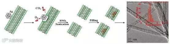 基于已有的认识,包信和课题组开发了碳纳米管内壁负载铁等金属的催化剂制备方法。首先通过银选择性氧化切断长碳纳米管,使得管口更多的暴露;再用硝酸洗去前一步残留的金属以及处理碳管的表面;最后通过超声和搅拌的方法将金属前驱盐在液相中浸渍到碳纳米管的内壁中。