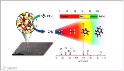 利用这种配位不饱和的单原子铁中心活化甲烷分子成吸附态的甲基,再通过1090℃的高温,使得甲基自由基挥发至气相,使得气相中的甲基自由基偶联,生成乙烯或者芳烃。在合适条件下,其乙烯、苯和萘的选择性>99%,实现了碳原子的极高利用。