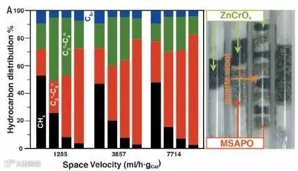 本文开头提到的包信和团队的重大研究突破就是围绕费托合成进行的。他们通过金属氧化物(ZnCrOx)和多孔SAPO沸石(MSAPO)组成双功能催化剂通过将CO活化和C-C键形成这两个过程分开,使得CO活化后形成的自由基被控制在SAPO分子筛中,通过限域效应控制了产物的选择性,从而突破费托合成的选择性限制,实现了令人惊奇的高达80%的低碳烯烃选择性。这一方法不仅降低了能耗而且理论上不需要消耗水,开创了煤转化的新途径。