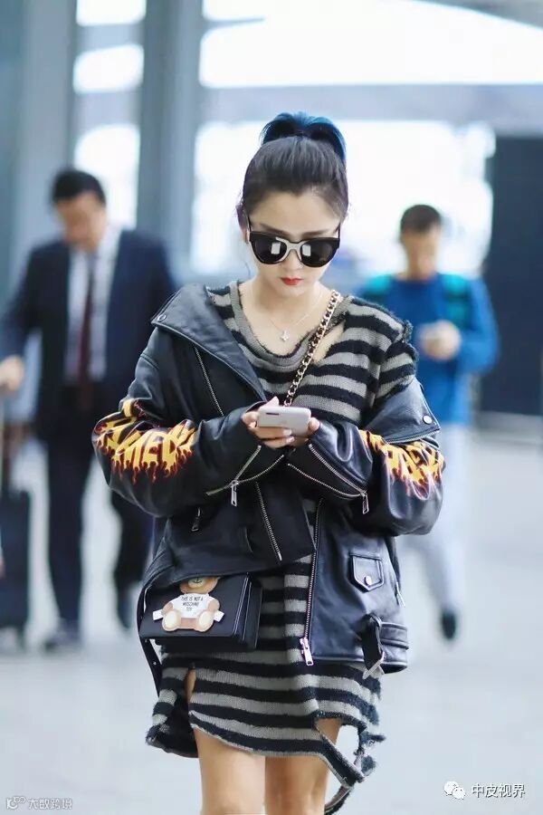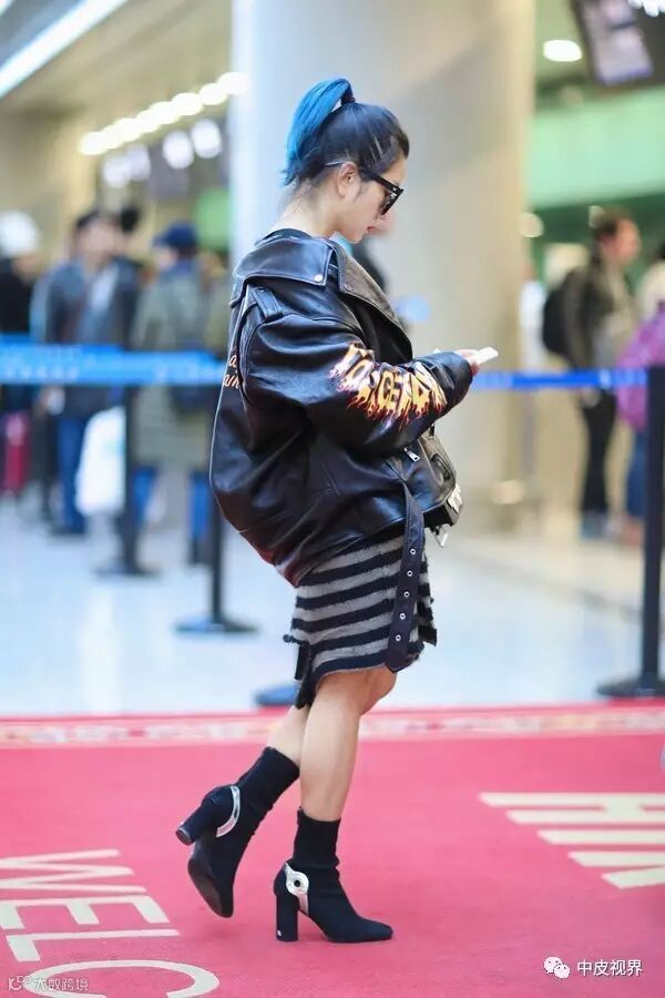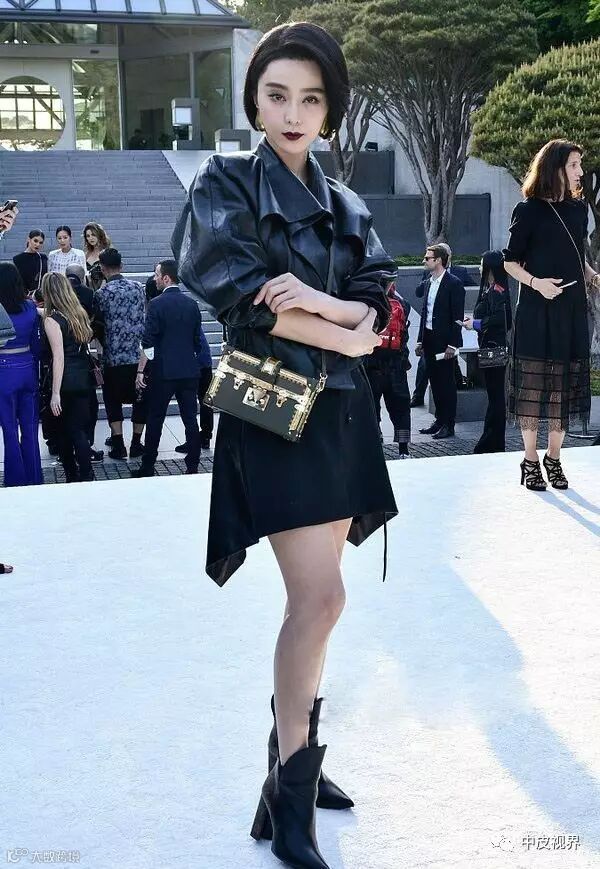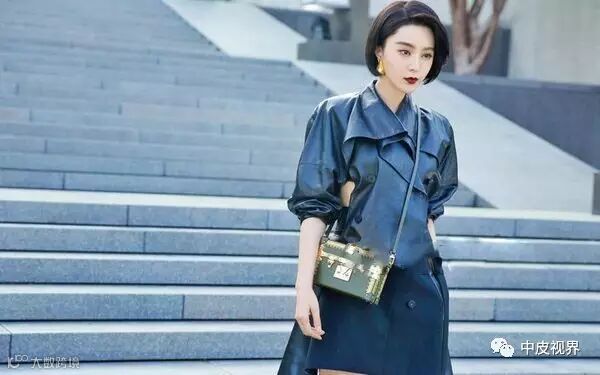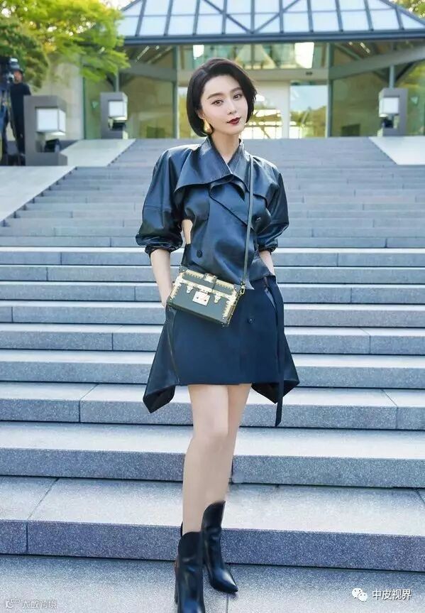 范冰冰身穿黑色皮衣,搭配不规则半裙,脚踩皮靴的造型让人眼前一亮。不仅帅气逼人还更加显瘦呢。