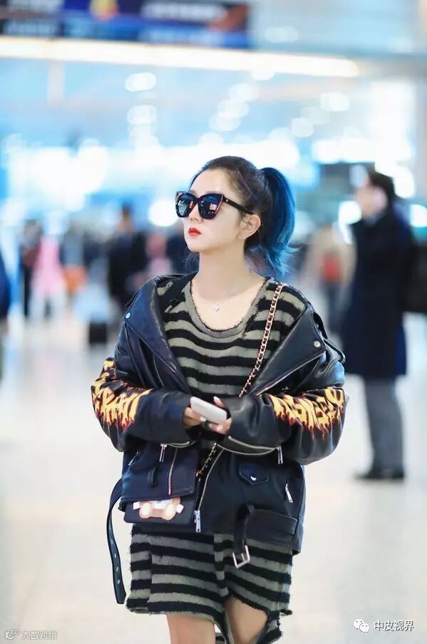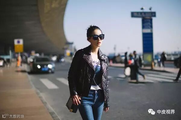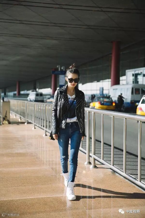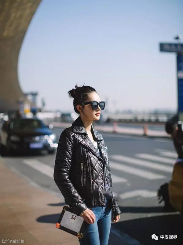 李沁穿皮衣,内搭白色印花潮T,简单休闲又不乏帅气有型的另一面。