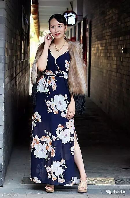 沙滩长裙一般是在海边穿着,皮草一般是在秋冬穿着,将大气花朵沙滩裙和皮草背心混搭一起,竟然将复古混搭风走了起来。