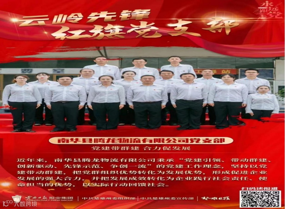 20年的稳健发展与责任担当,让南华县腾龙物流有限公司收获了行业与社会的广泛认可,累计荣获83余项荣誉。在资质认证方面,公司获评国家3A级综合型物流企业、国家3A信用企业、省级安全生产标准化达标企业、云南省林草产业省级龙头企业;在行业地位上,成为云南省物流与采购联合会副会长单位、云南省人力资源服务行业协会理事单位、中国道路运输协会会员单位、云南省工商联合会民营调查优秀示范企业、云南省民营小巨人企业;在综合荣誉方面,斩获全国“工人先锋号”、云南省“实践文明交通行动”示范企业、寒窗助学“爱心企业”等称号;党建领域的“云南省规范化建设示范党支部”“云南省先进基层党组织”等荣誉,更是对公司党建工作的高度肯定。