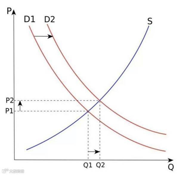 我们再看另外一个简单的经济学原理,“均衡价格”曲线(见下图),意思是:供给(S曲线)不变的情况下,需求(D曲线)越多(少),价格越高(低)。