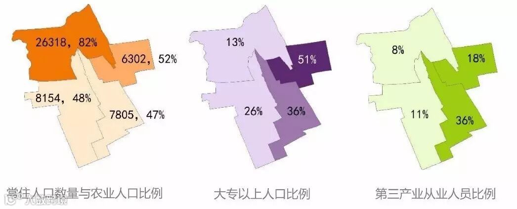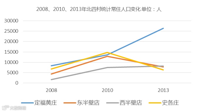根据北京市交通委统计,2008-2010年,北四村常住人口总量从2.1万迅速增长到4.9万,该总数一直维持到2013年末(图3)。其中,史各庄村与东半壁店村的常住人口出现减少,西半壁店村的常住人口较为稳定,而定福黄庄村的人口则急剧增加。可见,“北四村”常住人口正在向北部更外围的居住地搬迁。在常住人口结构方面,各村在农业人口比例、受教育程度以及就业结构等方面均存在较大差异,东侧的东半壁店村居住着较高比例受过大专及以上教育的人口(图4)。
