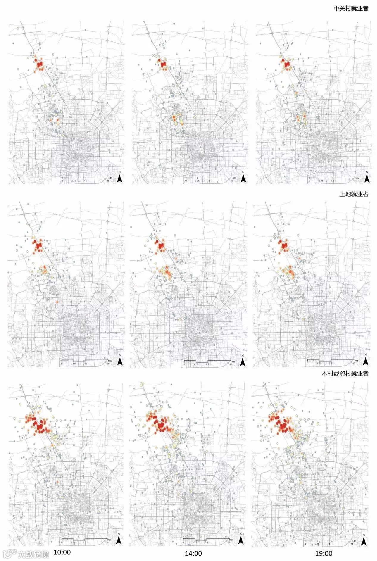 我们对2015年3月和7月两周的手机信令数据进行计算分析后,估算得到北四村常住人口约6-7万。其中,约75%为北京本地号码,外地号码中以河北号最多(图5)。常住人口就业地沿京藏高速分布特征明显,在北四村内部、回龙观等周边地区、上地以及中关村地区呈现显著集中区域,可以判断:北四村居民中,有一定比例人员从业于IT等科技服务类领域(图6)。