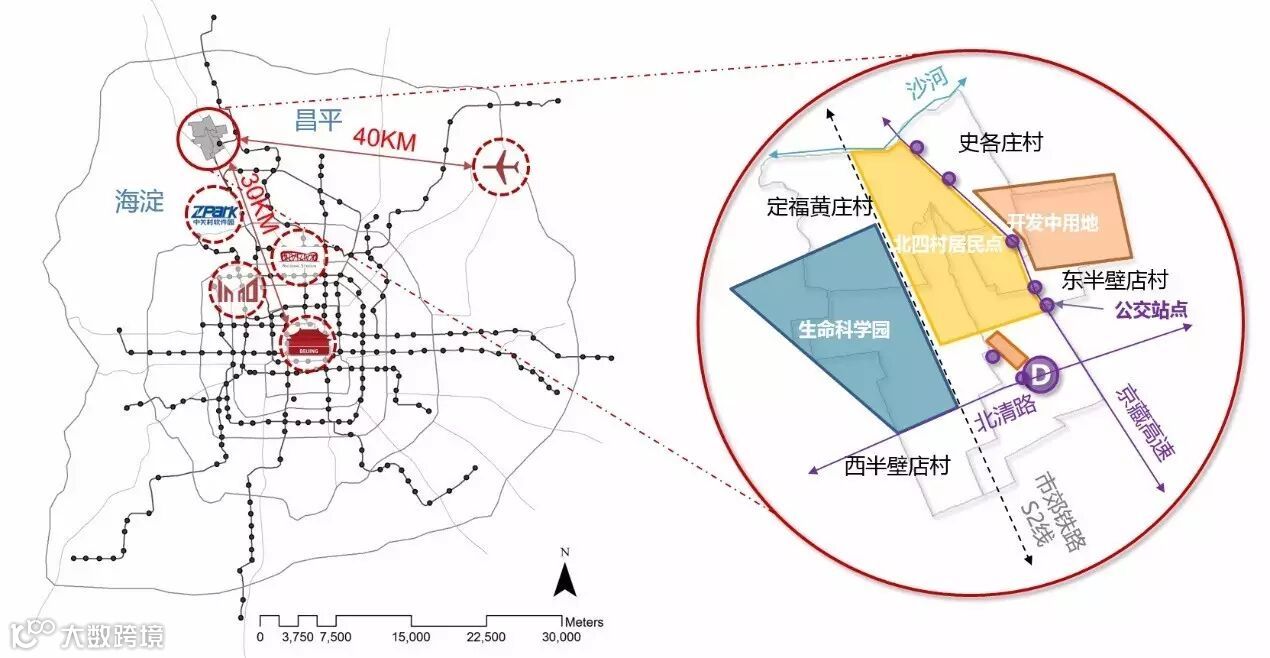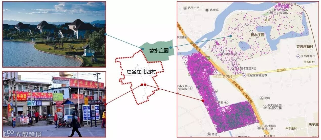 图1 北京城乡结合部,不同类型的空间相毗邻。右图引自北京大学刘瑜老师及其团队研究成果。