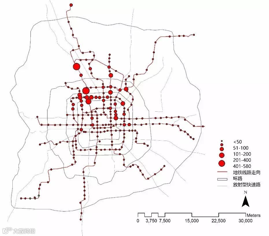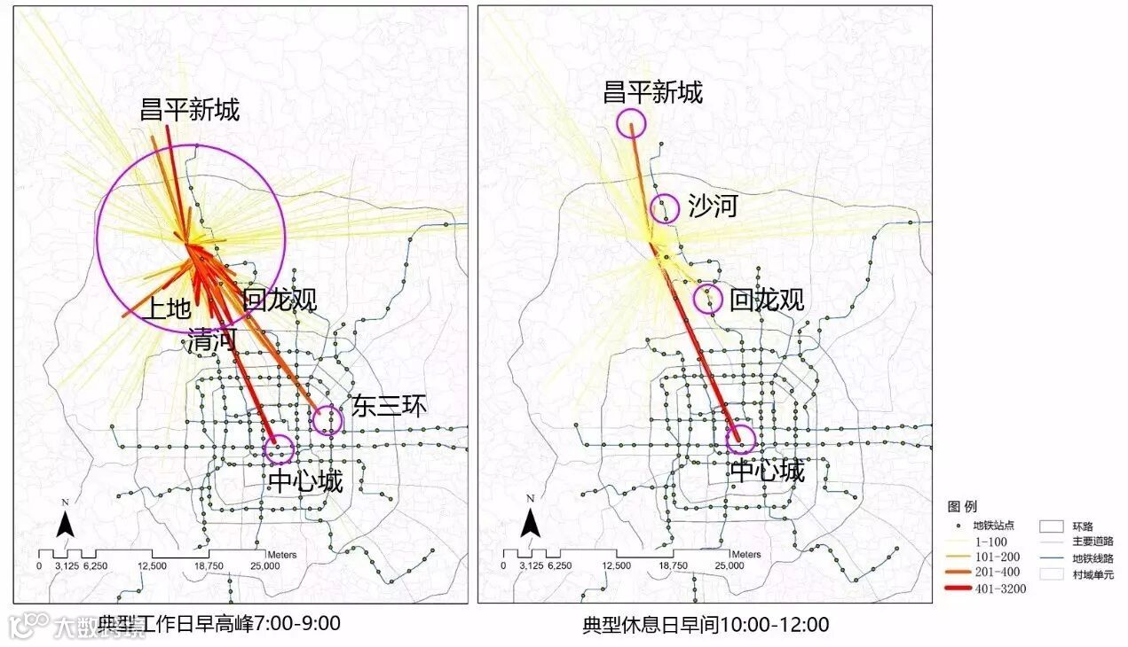 我们选取昌平线生命科学园地铁站,以及地铁生命科学园、史各庄村南、史各庄南、史各庄北、史各庄、定福黄庄、碧水庄园等七个公交站点,运用2015年8、9月的公交一卡通数据对北四村及其周边居民的出行行为进行描述。其中,公交和地铁人次统计数据均去除了生命科学园站换乘乘客的信息,尽可能还原了出发地和到达地在北四村周围人群的信息。