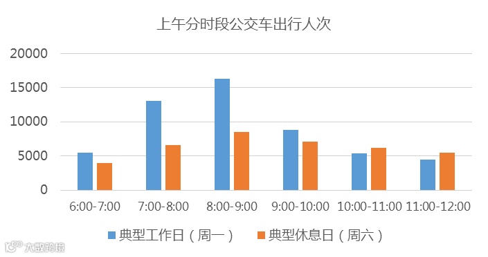休息日上午,公共交通出行人次在各时段分布较为平均,总量明显减少,这与手机信令数据分析得到的“周末宅在家”结论较为吻合。只有到了上午10:00-12:00,公交与地铁出行量才会超过同一时段工作日的出行人次(图10)。