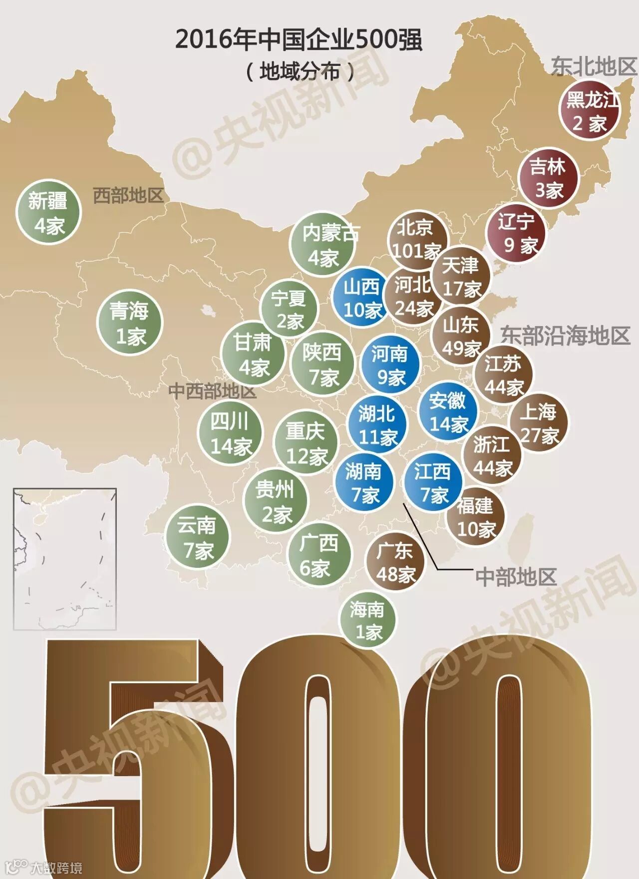 从榜单中可以看出,今年东部上榜365家,中部地区上榜58家,西部地区上榜63家,东北部上榜只有14家,东北上榜企业正逐渐减少。从数量上看,北京、山东、广东分别以101、49、48家企业的数量位列前三。500强企业地区分布看起来非常不平衡,超过60%的企业集中在东南部环渤海区域、长三角区域和泛珠三角区域的五个省市。