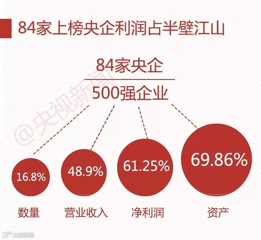 2016中国企业500强中,共有 84 家中央企业上榜,在数量上,占500强企业的16.8% ,但在营业收入、净利润、资产、纳税、员工人数等指标上占 500 强的 “半壁江山“ 或甚至七成。