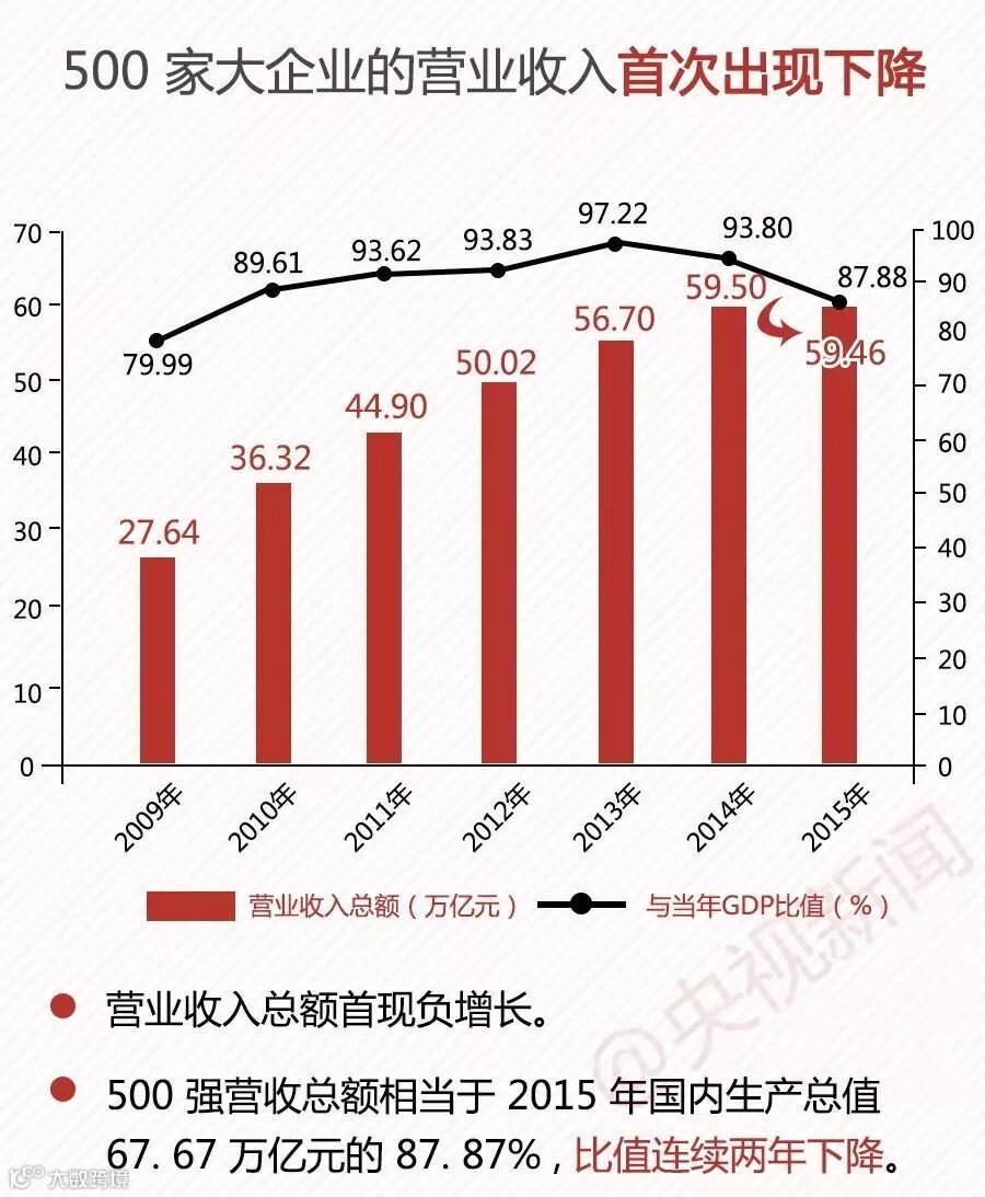 2016 中国企业500 强的营业收入总额达到59.46万亿元,较上年500 强营收总额下降了0.07%,虽然下降的幅度非常小,但却是中国企业500强评选历史上首次出现营收规模下降现象。