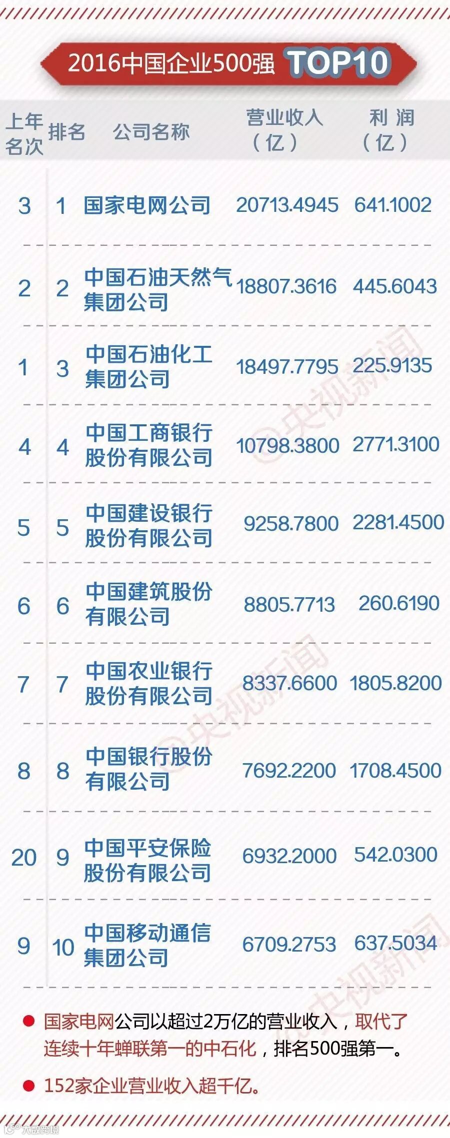 今年的500强,国家电网公司以20713.4945亿元的营业收入位列第一,取代了“十连冠”的中石化。