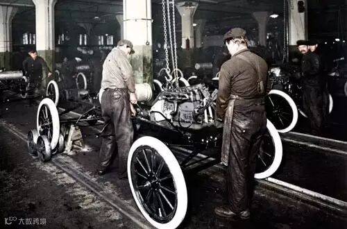 图片显示的是福特汽车生产线,这创造了现代工业基本生产方式。福特的贡献是,发明了汽车生产线,实现了汽车的产品开发,汽车生产的产业化。流水线之前,汽车工业完全是手工作坊型,按这种方式生产的汽车,每一辆都不一样,效率低、成本高。
