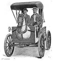 据说上图中是世界上第一辆汽车,大家可以看出它完全是按照马车的思路设计的,被称为“不用马拉的马车”(horseless carriage)。动力是蒸汽机,但车头是马的形状,汽车的方向仍然是靠缰绳来左右。