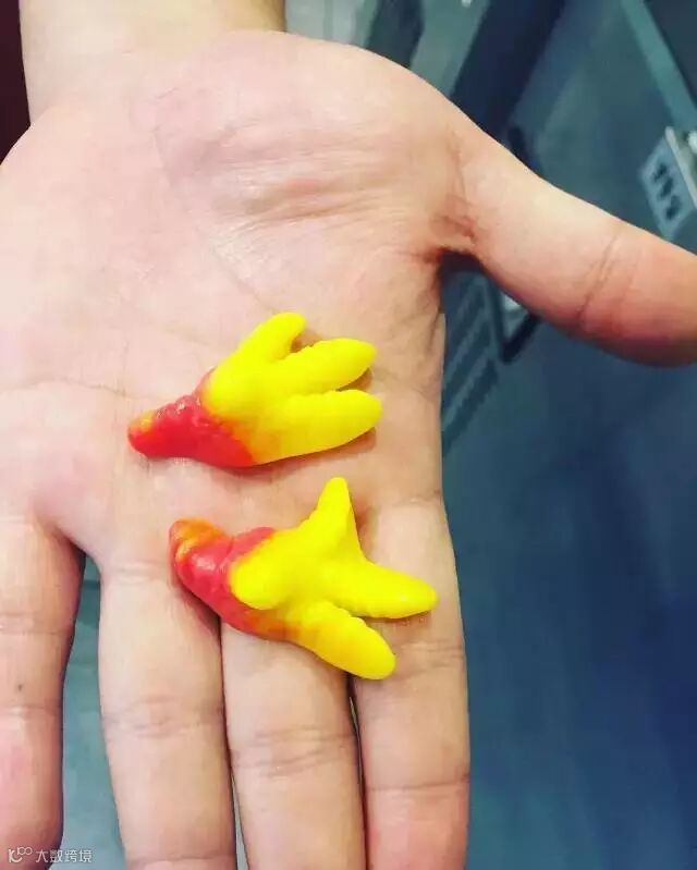在韩剧或是韩综都会看到他们的下酒菜之一「鸡脚」,就有业者发挥了创意把这个鸡脚形状做成了软糖,外表看起来真的超真的耶!但这个其实是覆盆莓口味的啦!