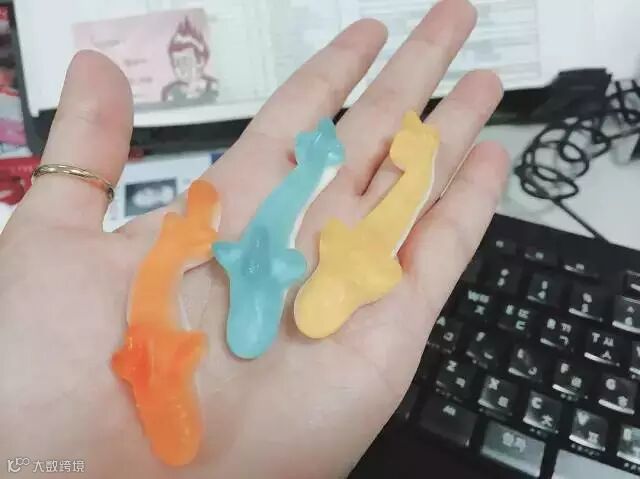 还有这个鲨鱼形状的,这样子看起来还真的有点疗愈啊!这样子小小包的也很适合放在包包里,上班嘴馋的时候可以拿出来吃啊(笑)~