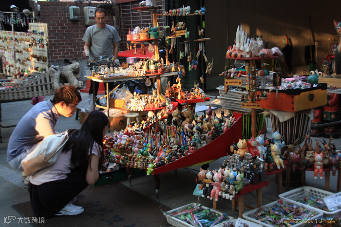 如果想在有限的时间里观赏到最具韩国特色的东西,那么仁寺洞绝对是不二选择。这里有销售民俗工艺品的工坊、画廊,还有飘着隐隐茶香的茶屋、韩式酒家,以及销售韩国特色小商品的纪念品店等等,是首尔的必游之地。因此在仁寺洞,比起韩国人,更多的是满眼好奇的外国人。