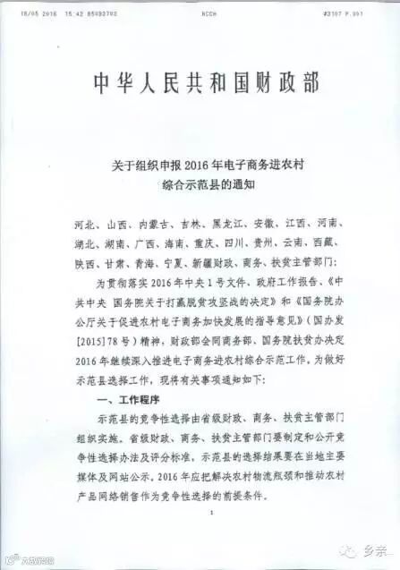 为贯彻落实2016年中央1号文件、政府工作报告、《中共中央国务院关于打赢脱贫攻坚战的决定》和《国务院办公厅关于促进农村电子商务加快发展的指导意见》(国办发[2015]78号)精神,财政部会同商务部、国务院扶贫办决定2016年继续深入推进电子商务进农村综合示范工作。为做好示范县选择工作,现将有关事项通知如下: