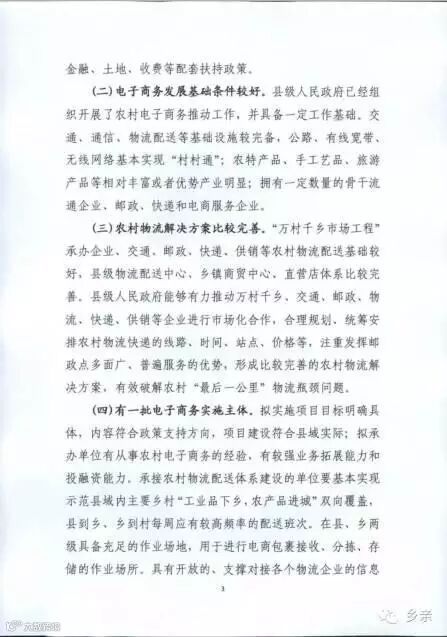 (二)电子商务发展基础条件较好。县级人民政府已经组织开展了农村电子商务推动工作,并具备一定工作基础。交通、通信、物流配送等基础设施较完备,公路、有线宽带、无线网络基本实现“村村通”;农特产品、手工艺品、旅游产品等相对丰富或者优势产业明显;拥有一定数量的骨干流通企业、邮政、快递和电商服务企业。