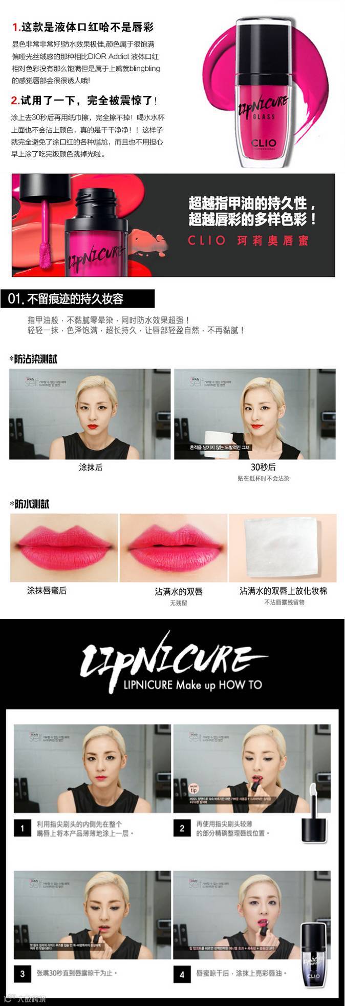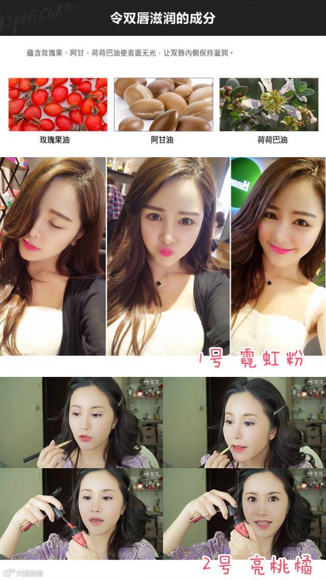 如指甲油般璨耀炫动,不黏腻零晕染,同时防水效果超强!轻轻一抹,双唇立感丰润饱满,二次涂抹,释放明艳色泽,令双唇更加立体丰盈,诱惑难挡!