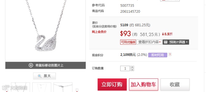 这款天鹅项链是他们家的明星产品,带到脖子上刚好卡在锁骨左右的位置,blingbling的也是优雅的天鹅化身呢!至于中韩这个差价,啥也不说了,买吧!