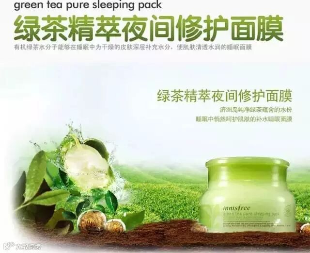【产品特点】:悦诗风吟绿茶睡眠面膜,含有绿茶特效成分,在更加保湿的情况下清爽容易吸收,号称"水桶"的天然植物因子给皮肤持久提供水份。清爽不油腻!所有缺水补营养肌肤都可用!绿茶系列最大的特点就是,补水保湿却一点也不油腻!
