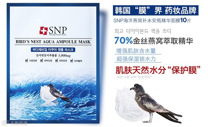 SNP韩国的药妆品牌,此款面膜含有高浓缩燕窝原液,集中供给皮肤水分。锁水能力突出,在皮肤水分子表面形成保护膜防止水分快速流失,令皮肤长时间保湿不缺水。适合人群:1. 水分不足引起干燥的皮肤2. 因皮肤干燥起皮屑的皮肤3.肤色不均的皮肤;过敏性皮肤