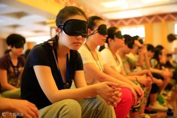 所有学员全部蒙上双眼,手拉着手,全程止语,在引路人的引导和义工们的护持下,走一段完全陌生的路。出门、上下台阶、经过障碍、穿堂入室……在“失去光明”后,每个人都紧紧拉住同伴的手,体会到团体的重要,同时也体会到自己的责任感;每个人的心都突然变得细腻而柔软,当自己遇到磕碰时,想着用身体的动作来提醒后面的人;当大家终于穿越重重“障碍”,回到见行堂,摘下眼罩,见到身边的同伴时,内心涌上的加倍的感恩与温暖。