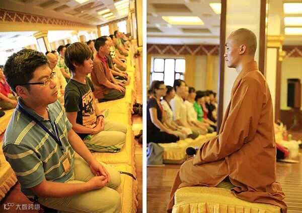 禅修可以采用各种不同的姿势,其中坐姿是最常见的一种,而这次学员们体验的是跪坐式——金刚跪。学员们大多数平常都是坐在电脑前伏案一整天,缺乏锻炼的身体,稍跪片刻便开始酸痛麻胀。法师缓缓说道:“这正是我们要用功的时刻。禅修,就是要超越我们身体、念头对心灵的干扰。”当大家渐渐快忍不住疼痛时,法师鼓励大家坚持下去,一旦突破了“临界点”,疼痛感就会慢慢消失。法师说:“我们感受的苦,取决于我们内心的大小。心胸越大,对苦的承受能力就越大;心胸越小,越执着于一点苦的地方,就会死死地抓住那个所谓的疼,一直纠结、排斥,一直不愿意去直视它、包容它、面对它,这就是我们一直痛苦,乃至不能超越痛苦的根本原因所在。”