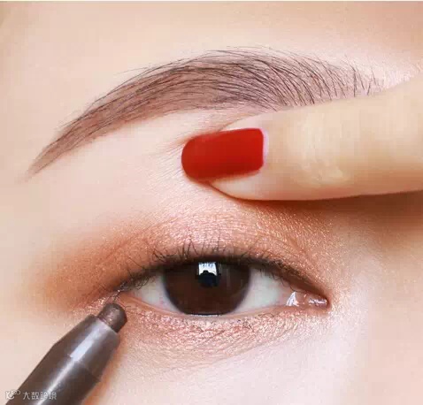 STEP4:棕色的眼影在双眼皮范围内加深,下眼睑画到眼中位置即可。