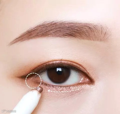 STEP8:下眼线从眼头开始向后拉,下笔要轻,与眼尾留下图中圆圈那么大的空白,会让眼睛看上去更大。眼线下方用浅豆沙色的眼影笔提亮。