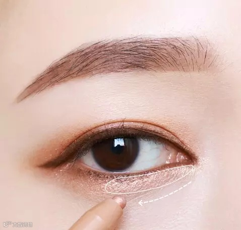 STEP9:下眼睑的眼头到眼中的位置用豆沙金色的卧蚕笔增强提亮的效果。
