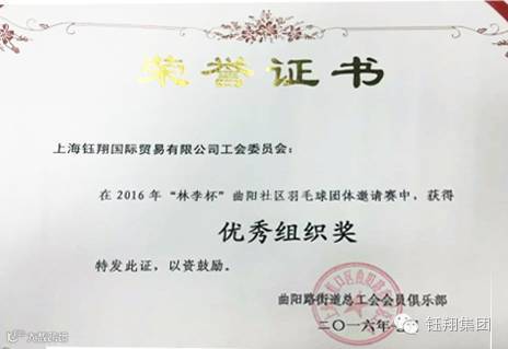 7月6日,钰翔国贸受邀参加2016年”林李杯”曲阳社区羽毛球团体赛并获优秀组织奖。此次活动由曲阳路街道总工会主办,比赛采取5局3胜团体循环赛制。