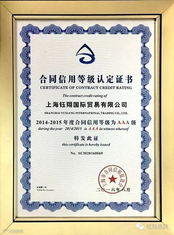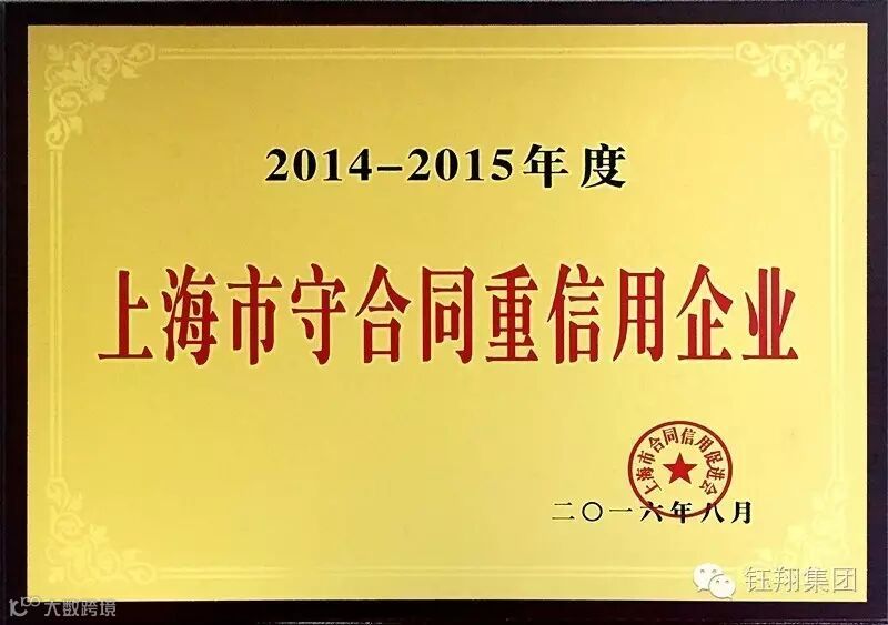 今年8月,集团下属钰翔国贸等三家子公司荣获上海市合同信用促进会“2014-2015年度上海市守合同重信用企业”荣誉称号,其中两家同时获得“2014-2015年度合同信用等级AAA级”认定,一家获得“2014-2015年度合同信用等级AA级”认定。此项荣誉的获得,是上海市政府工商管理部门和社会各界对钰翔集团诚信经营的认可,是集团重要的无形资产,对打造“百年钰翔”有着重要的意义。