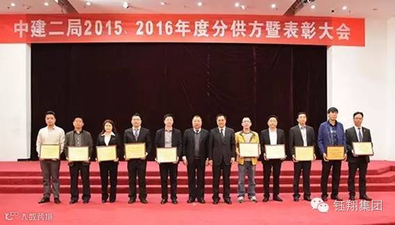 3月29日,中国建筑第二工程局有限公司在北京召开2015、2016年度分供方暨表彰大会,集团旗下子公司上海钰翔国际贸易有限公司荣获“中建二局2015年度优秀供应商”荣誉称号。中建二局总经理程贵堂等领导为优秀供应商颁发了奖牌,钰翔国际作为优秀供应商在会上播放了钰翔集团企业形象宣传片,全体参会领导和嘉宾观看了宣传片,引起热烈反响,大家纷纷对集团的企业文化和32年来取得的成绩表示赞赏。