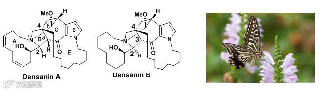 Densanins是来源于韩国近海海洋海绵Haliclona densaspicula的一类大环二胺生物碱。Densanins具有令人炫目的三维空间结构,在四氢吡咯/环庚酮/吡咯三环母核周围环绕了一个十五元环和一个十一元环,就像蝴蝶的一双翅膀。生物活性研究表明,densanins对脂多糖诱导的小胶质细胞中一氧化氮的产生具有中等程度的抑制作用,是可用于治疗神经系统疾病的潜在药物。