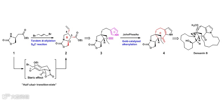 近日,陕西师范大学小分子探针团队的杨俊教授课题组首次报道了densanins BCD 三环母核的合成。以手性化合物1为起始原料,通过N-烯丙基化-SN2'串联反应高效、立体选择性的合成了吡咯烷B环。随后,利用酯基α-位烷基化构建了C-4位季碳中心,通过3-碘吡咯与末端炔发生Sonogashira偶联完成吡咯环D的组装。最后,采用金催化的芳烯化反应构建了七元C环。该策略为这类天然产物全合成的实现和进一步的药物化学研究打下坚实的基础。
