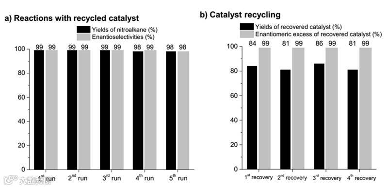 作者还使用回收的催化剂再进行实验,发现回收的催化剂的催化性能没有受到任何影响。此外作者还检测了产物的对映选择性,发现没有任何程度的损失(Figure 4)。催化剂的稳定性是获得高TON的必要条件。